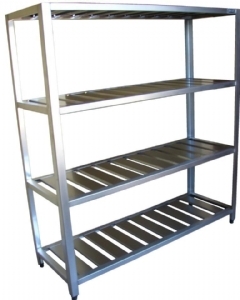 Estante vertical em aço inox com 4 planos lisos ou gradeados. Medidas padrão 1000, 1200 e 1500 mm. Profundidades 400 ou 500 mm. Altura padrão 1800 mm. Outras medidas sob consulta.